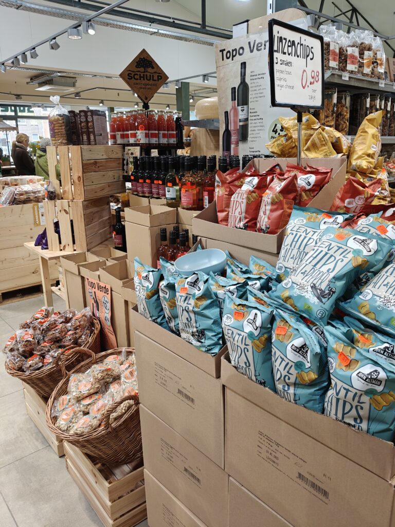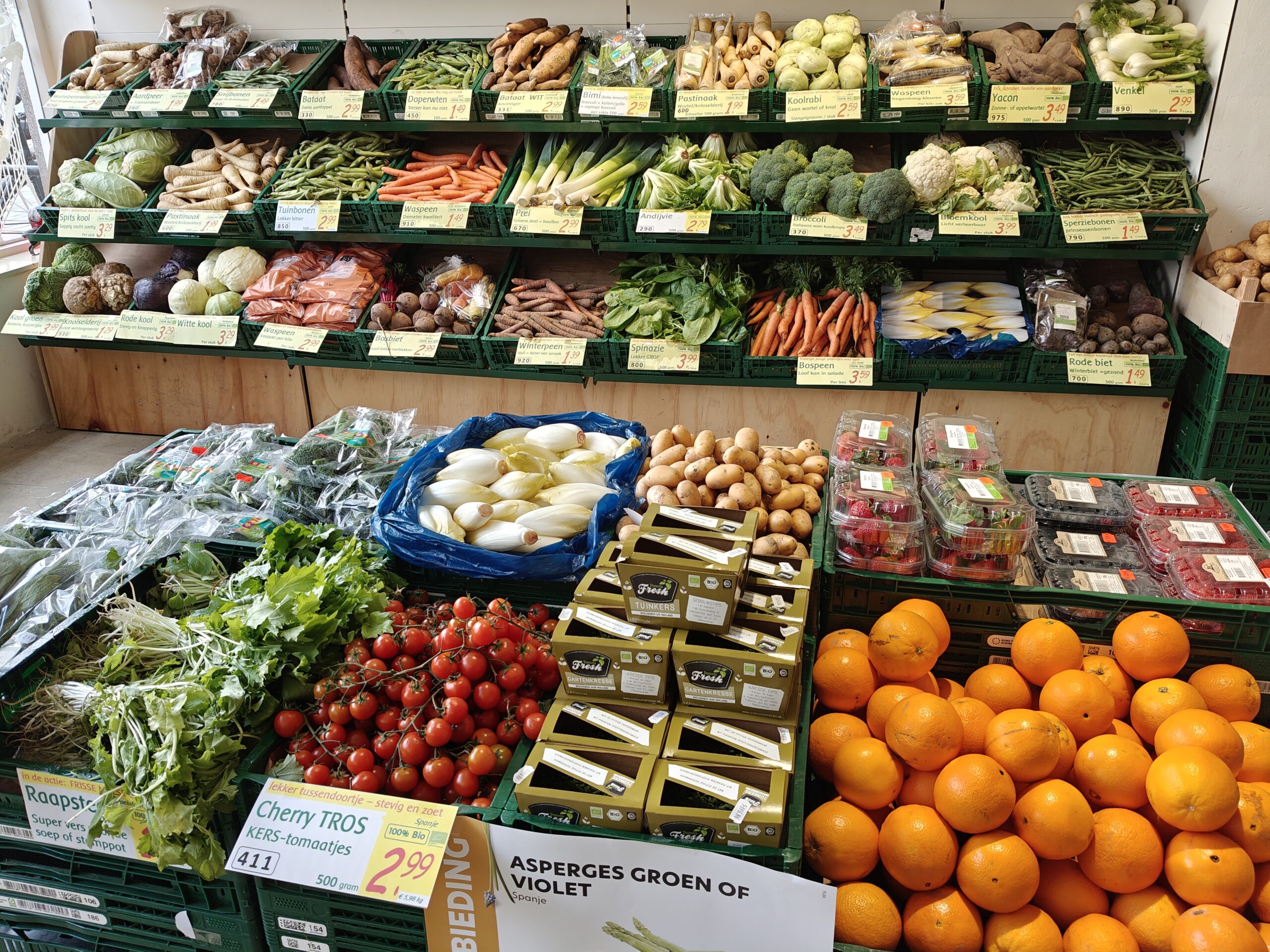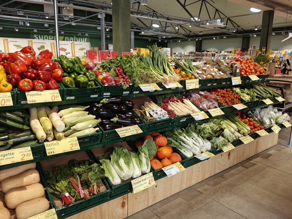 Direct als u binnenkomt ziet u de schappen met verse biologische en biodynamische groente.